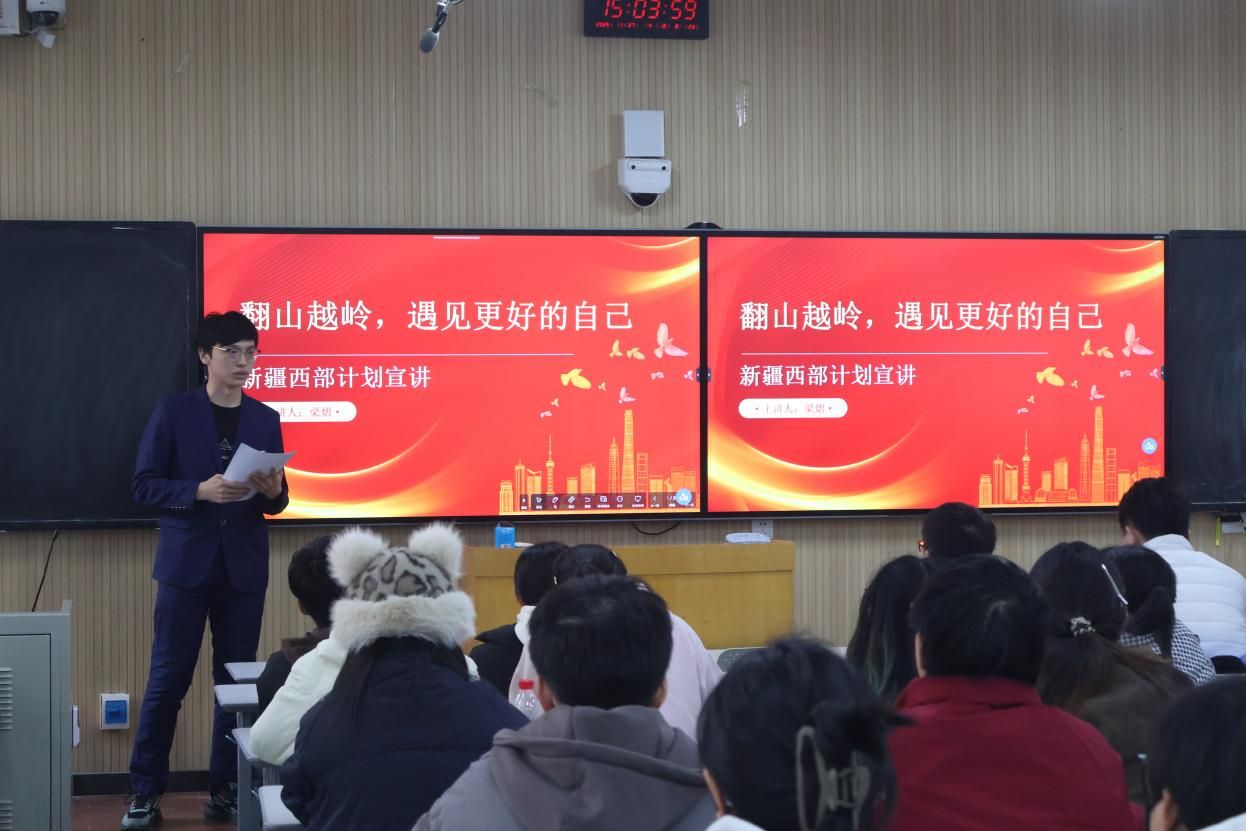 为深入贯彻落实习近平总书记关于青年工作的重要思想,加强我校青年学子对西部计划的认识和了解,引导和鼓励毕业生投身西部基层建功立业,11月27日下午,一场以“翻山越岭,遇见更好的自己”为主题的大学生志愿服务西部计划优秀志愿者事迹分享会在我校成功举办。本次活动特邀我校2025届优秀毕业生、现服务于新疆乌鲁木齐的西部计划志愿者梁熠回到母校,为在校生带来了一场真挚感人、催人奋进的宣讲。