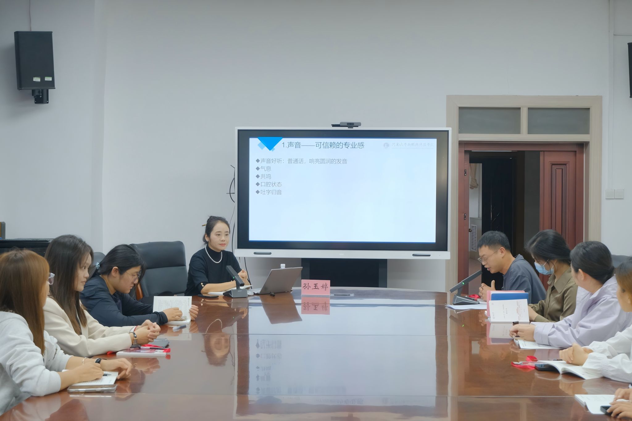 为进一步提升“争先”校园讲解队成员的专业讲解能力与现场调适能力,9月25日下午,我校“争先”校园讲解队第四次培训在明伦校区历史文化学院三楼会议室举行。本次培训特邀新闻与传播学院播音与主持艺术专业教师孙玉婷担任主讲,围绕如何提升心理素质、语言表达与即兴演讲能力等方面开展专题指导。